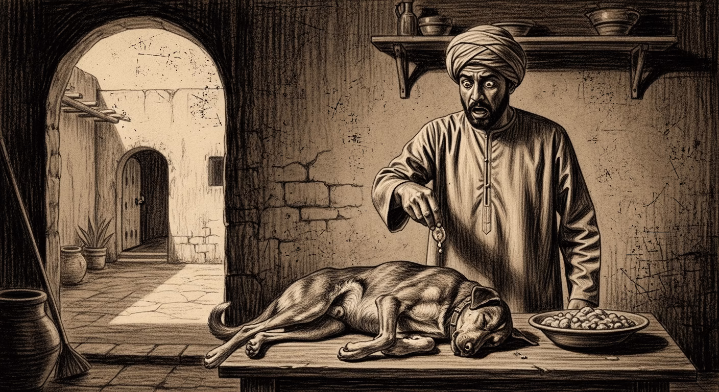 The dog moved away from the food offered by its master, refusing to eat. It continued to bark loudly, its eyes fixed on the poisoned dish, trying with all its might to convey the grave danger that awaited the merchant.